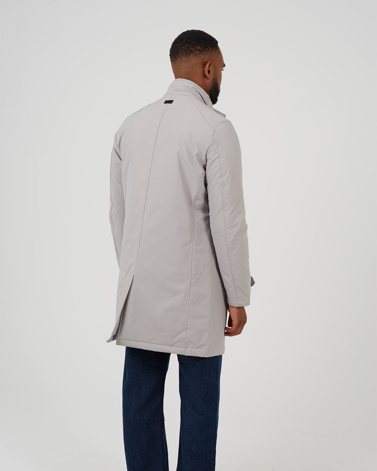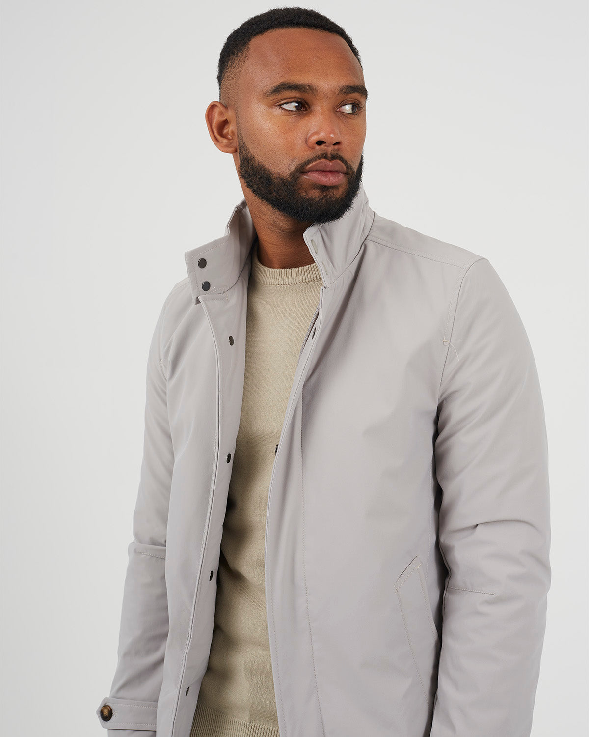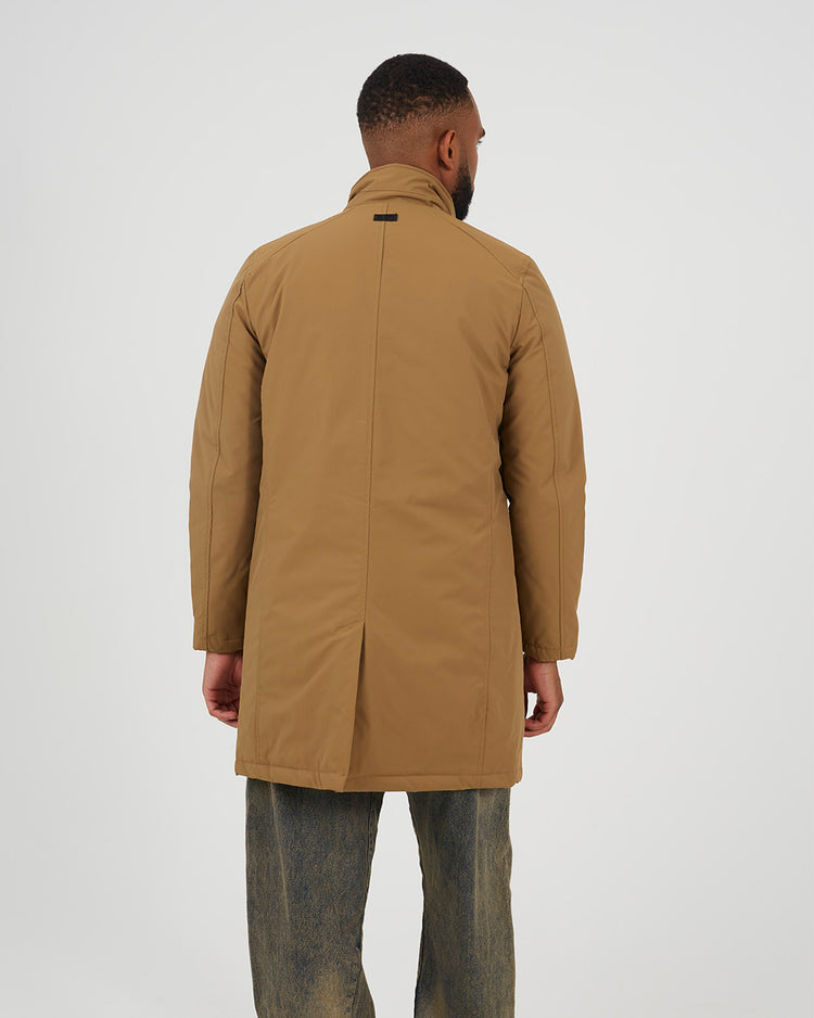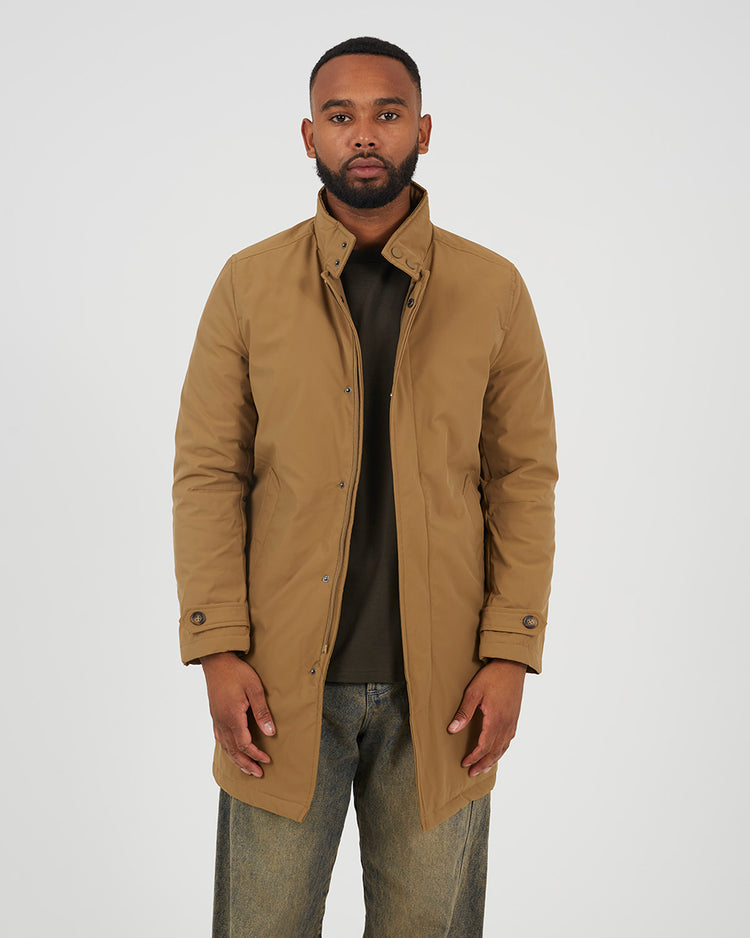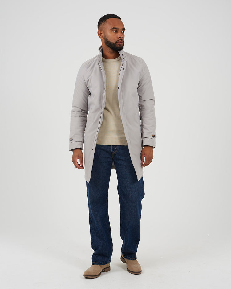 Chaqueta para hombre larga con cierre de cremallera y botones a presión. Con cierre en el cuello con dos botones a presión. Dos bolsillos inferiores y galones en las mangas