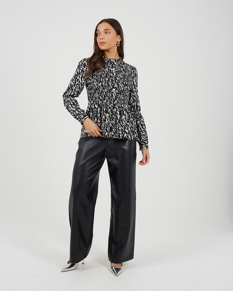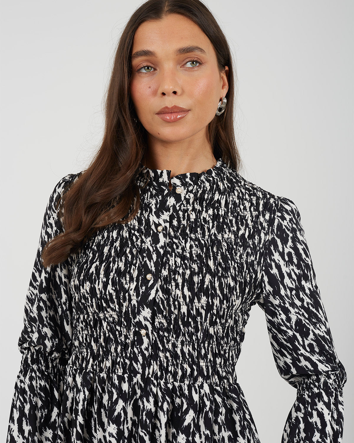 Blusa de mujer estampada con botones y manga larga y detalle fruncido.