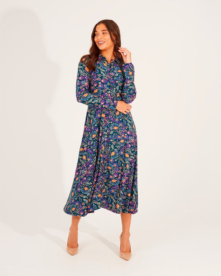 Vestido estampado largo de manga larga y cuello redondo cierre mediante botones y detalle fruncido.
